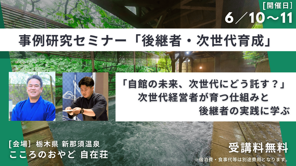 「自館の未来、次世代にどう託す?」をテーマに、 次世代経営者が育つ仕組みと、後継者の実践について実例を交えてご紹介するほか、那須町観光協会 常務理事の伊藤美香様より、データを活用した那須のまちづくりや現場を支えるスタッフの確保と定着についてご講演いただきます。
