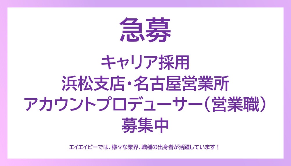 現在、エイエイピーでは、静岡県西部から中京地区のクライアントを担当していただけるアカウントプロデューサー(若干名)を募集しています。