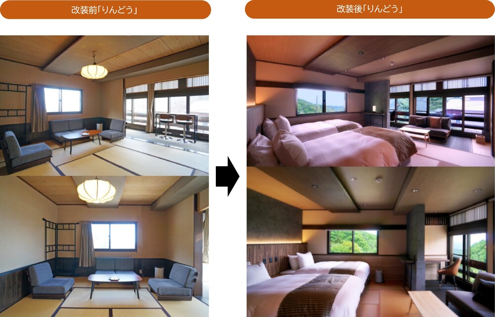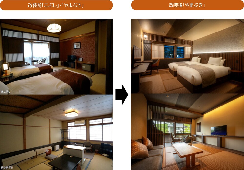 各部屋の占有面積が23㎡程度であった標準的な客室の「やまぶき」と「こぶし」の隣接する2部屋を、新たな「やまぶき」として1部屋に改装。セミダブルベッド2台を備えたベッドルームと、パーソナルチェアやカウチを配置したリビングスペースを有する、ゆったりと寛ぐことができるデラックスタイプの客室へと生まれ変わりました。