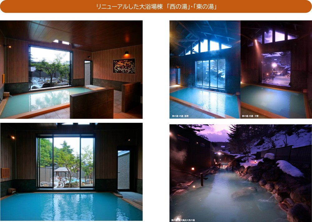 建物の北側に位置する露天風呂「大気の湯」の東端と西端に位置する湯屋をリニューアル。露天風呂と内湯の一体感を強めると共に、客室から続く廊下も木の温かみを活かしたデザインを施し、気候コンディションにかかわらず、高湯の良質な温泉をゆるりと楽しんでいただくことが出来るようになりました。